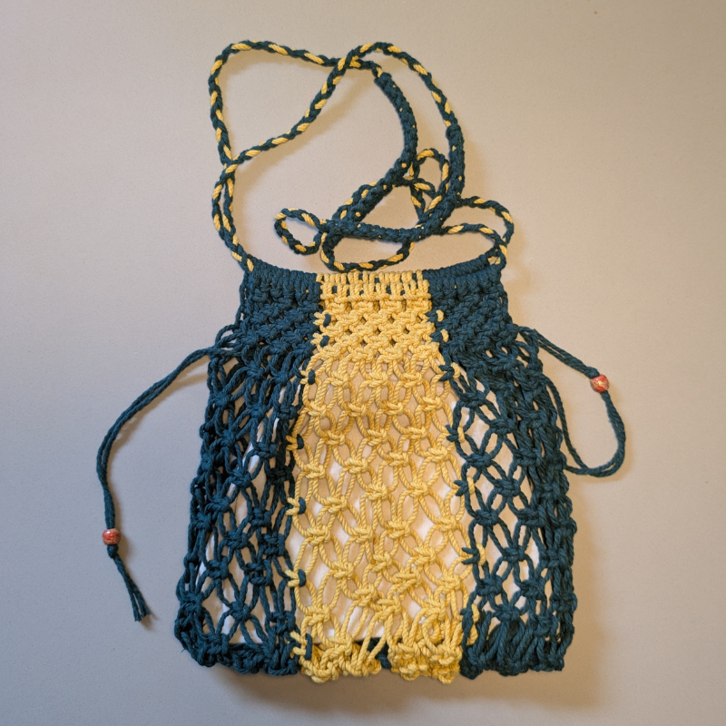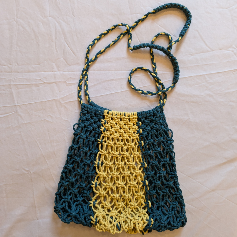 Trendy handmade macrame crossbody bag featuring a teal and yellow dual-color woven pattern. Lightweight, stylish, and perfect for daily use.