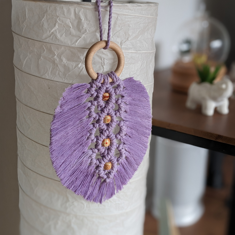 This elegant handmade macrame feather hanging features soft knotted textures, delicate bead accents, and a natural wooden ring. Perfect for wall or lamp decor, it adds a calm, boho-inspired charm to any living space.