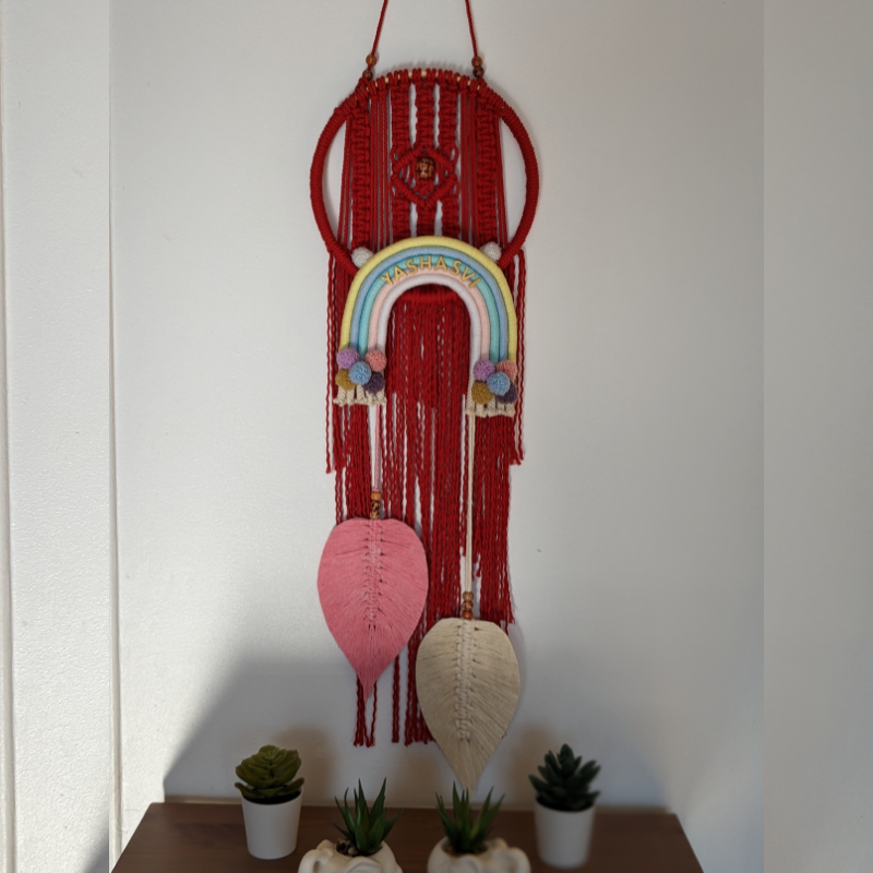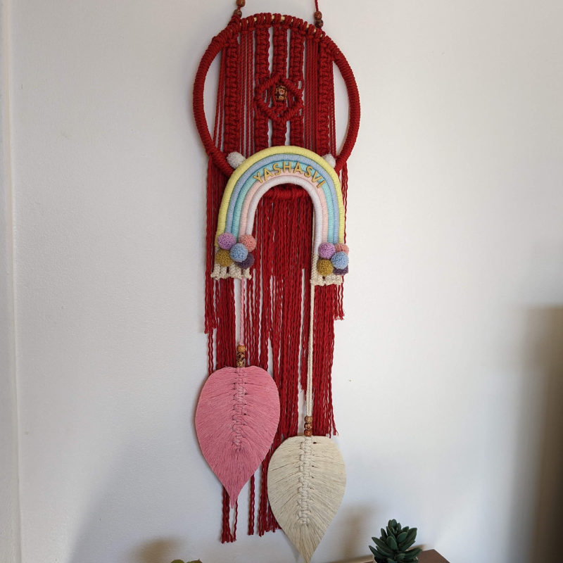 Handcrafted macrame wall hanging with rainbow and leaf accents.