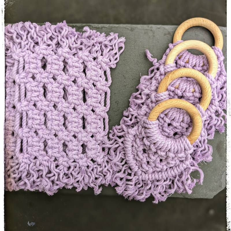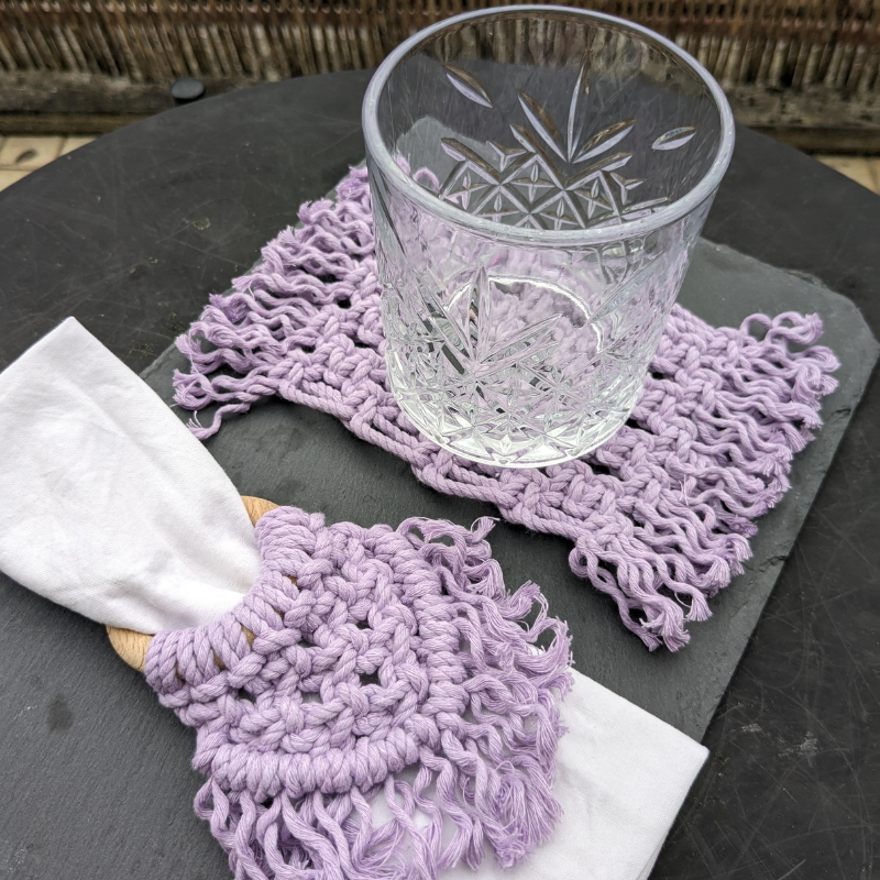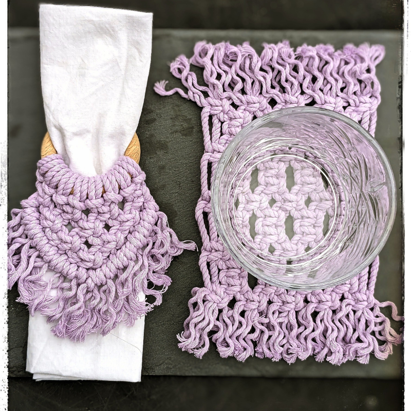 This beautiful handmade macrame set includes a stylish napkin ring and matching coaster with soft knotted texture. Perfect for table decor, dining setup, or gifting, it adds a calm and elegant touch to any table setting.