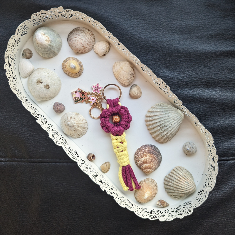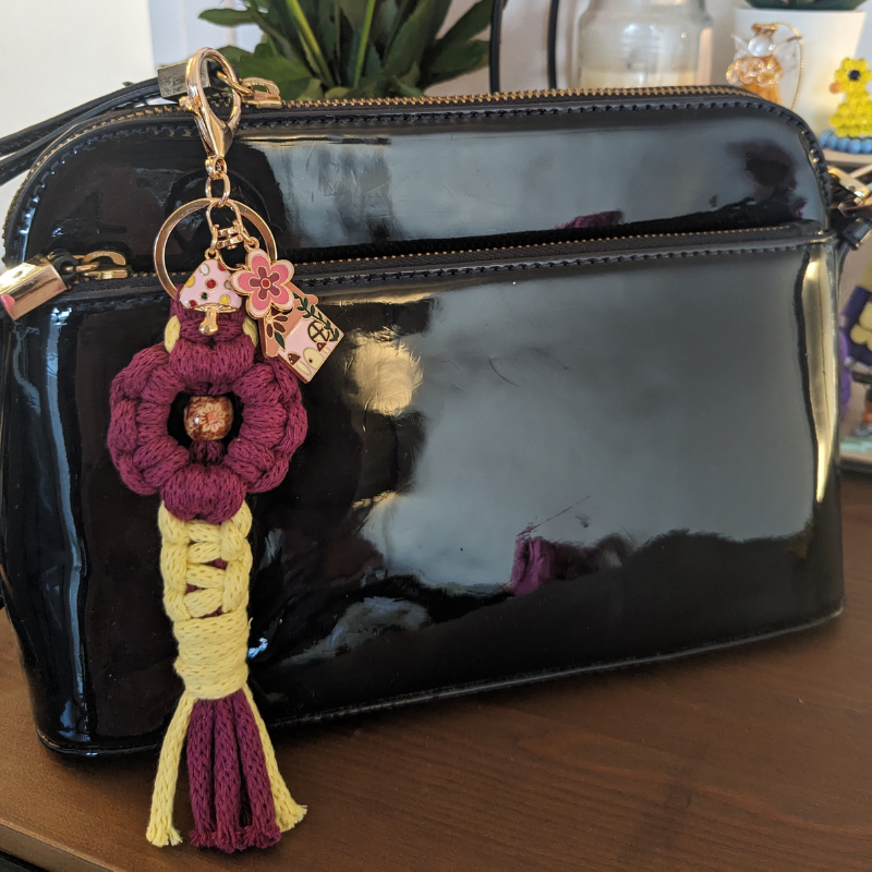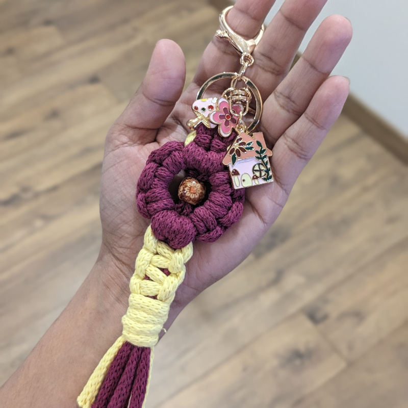 Handcrafted macrame flower keychain with tassel detail.
