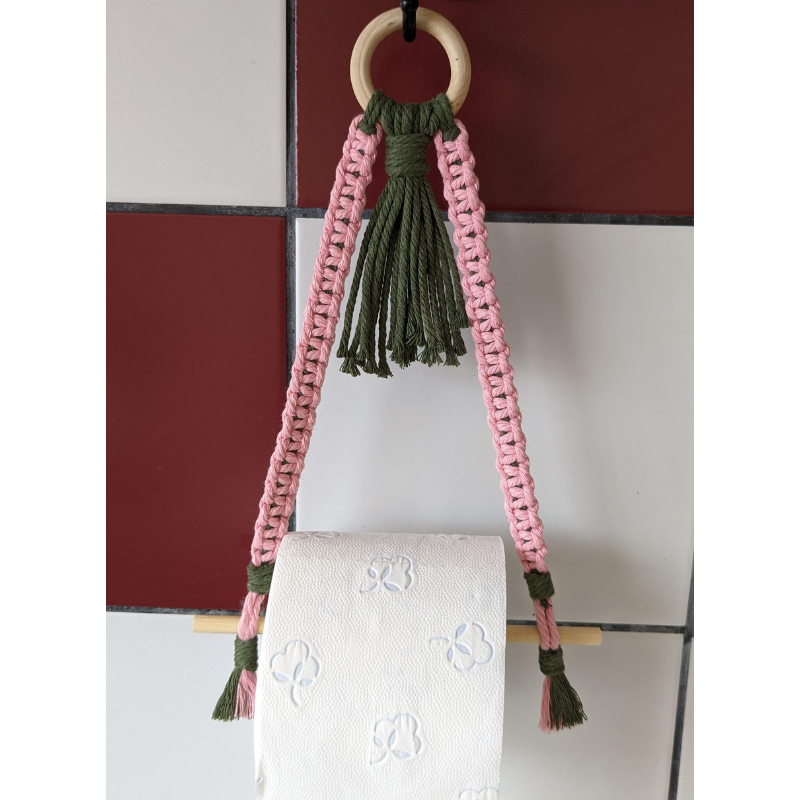 A hand-knotted macrame holder in soft pink and sage green, designed to bring a touch of artisan charm to your kitchen or room .