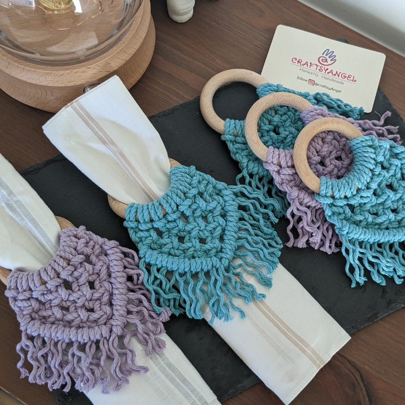 A charming set of handcrafted macrame napkin rings in soft lavender and teal, perfect for adding a bohemian touch to your table setting.