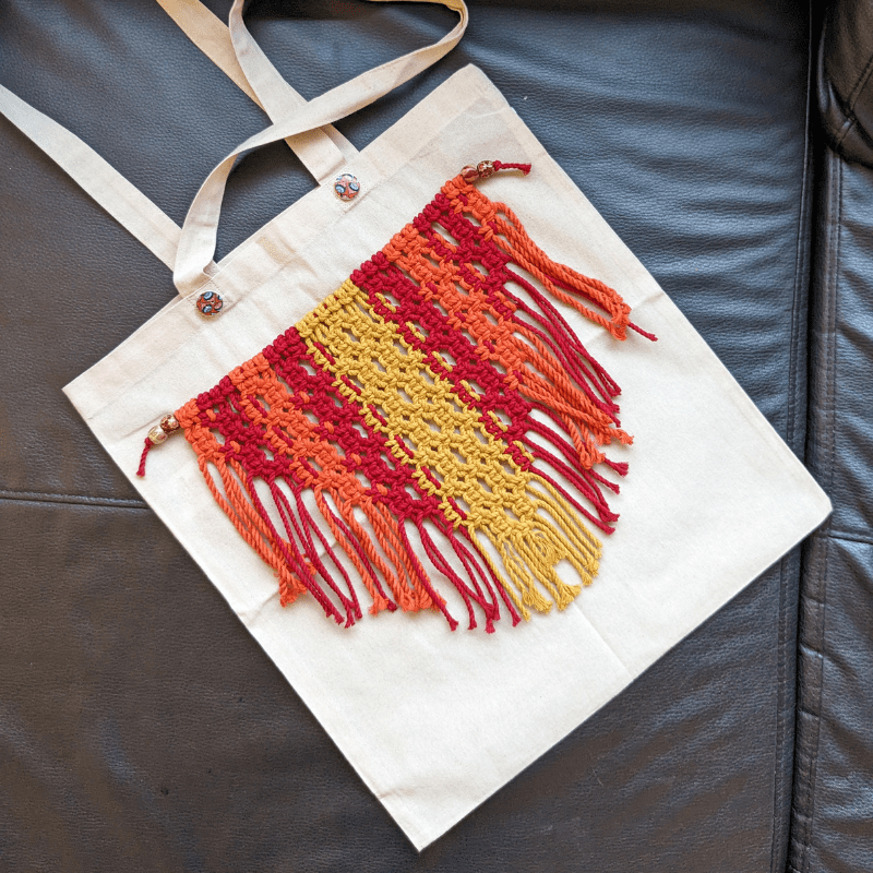 Stylish handmade cotton tote bag with macrame fringe in vibrant red and yellow. Spacious, eco-friendly, and perfect for daily use or outings.