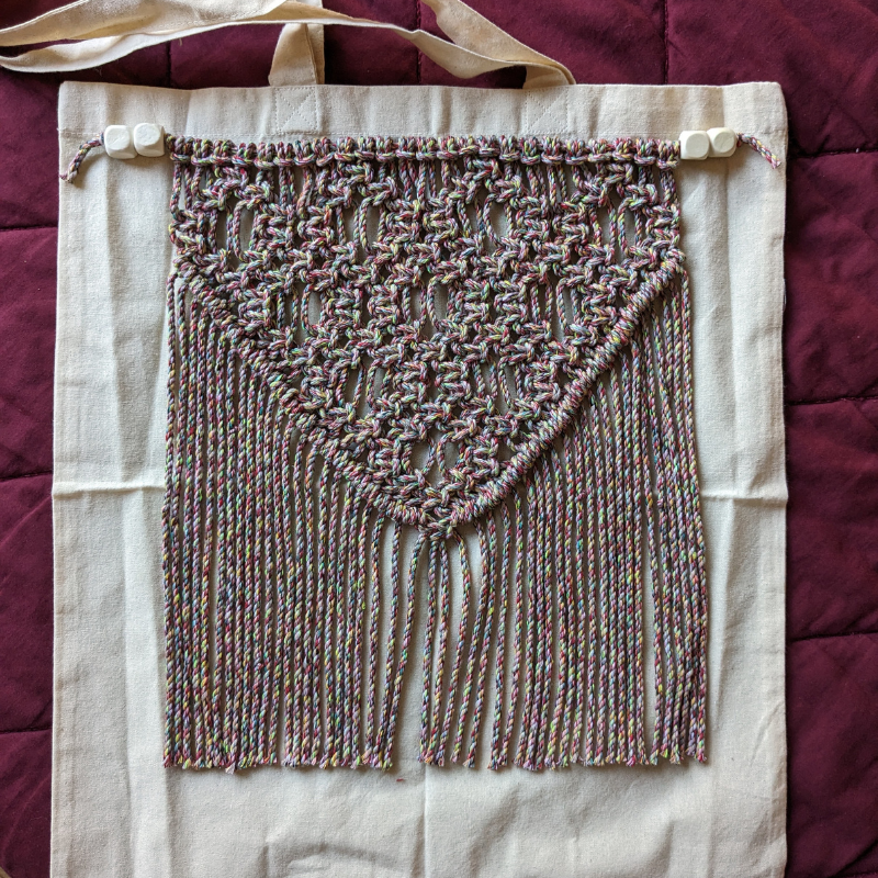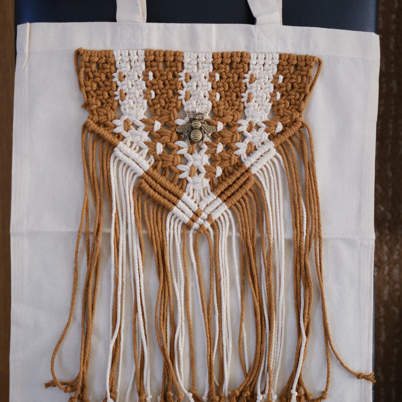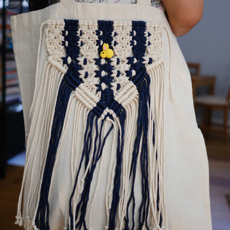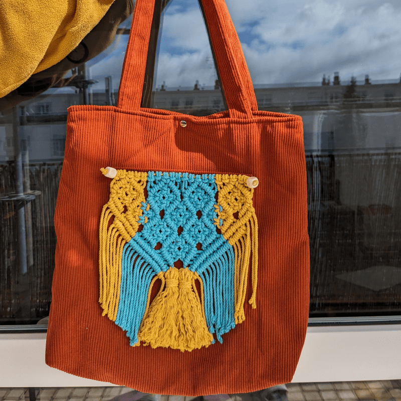 Step up your style game with our Handmade Macrame Tote Bag, a perfect fusion of sustainability and fashion. Made from durable cotton fabric, this tote features an eye-catching macramé fringe panel in vibrant red and yellow tones, giving it a chic boho vibe.