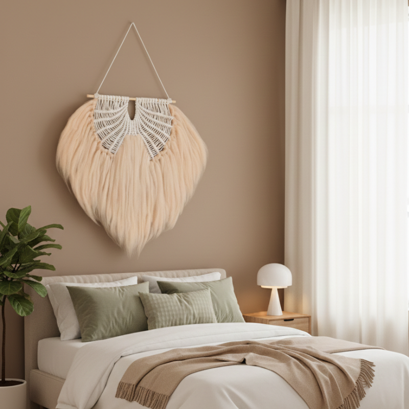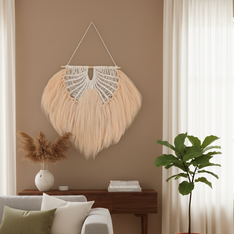 This handcrafted macrame wall hanging features intricate cotton knot detailing and soft flowing wool fibers. Designed in neutral earthy shades, it enhances interiors with a cozy, minimalist, and boho-inspired look. Lightweight and easy to hang, it’s perfect for bedrooms, living rooms, or creative spaces.