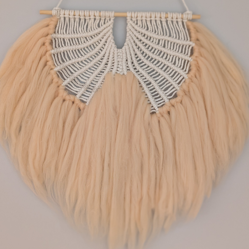Handcrafted macrame wall decor made with soft wool and cotton cords. Its neutral tones and elegant texture add warmth and a modern bohemian touch to any bedroom or living space.